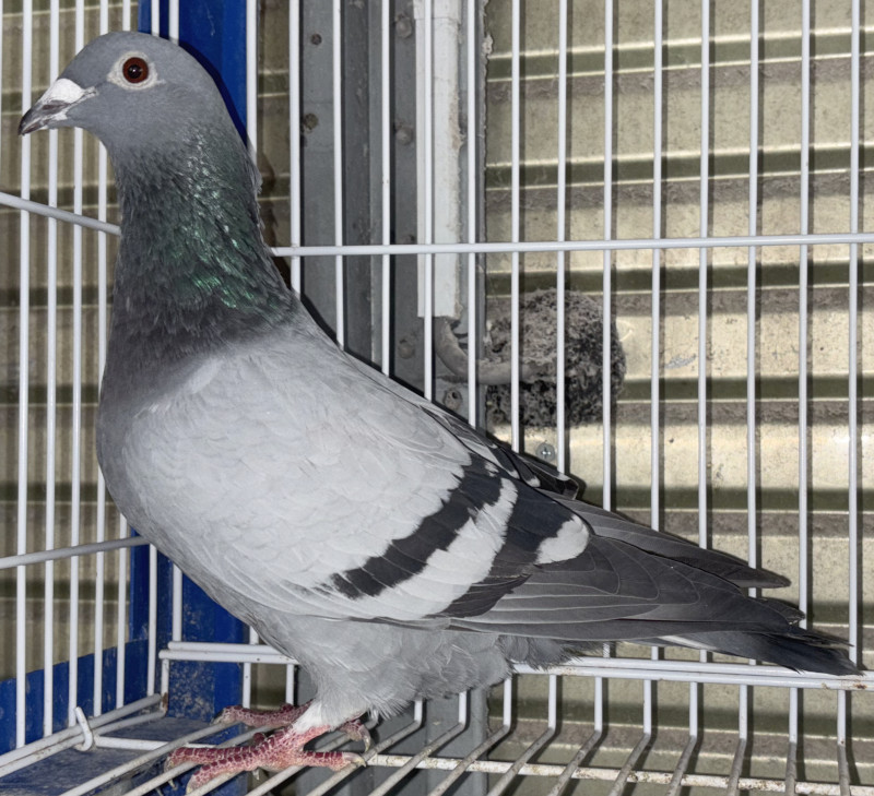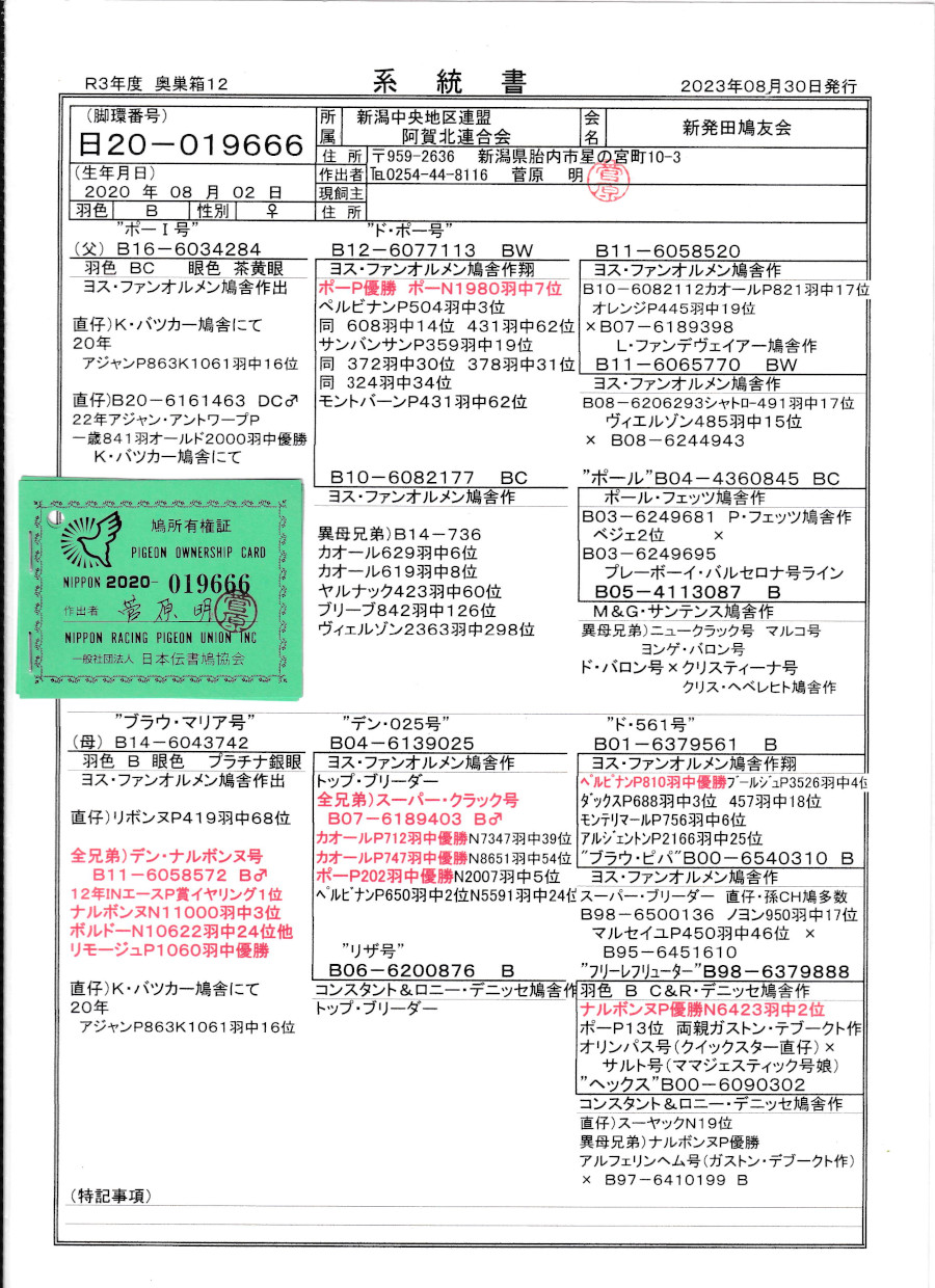 出品鳩「日20−019666 B ♀」菅原 明鳩舎作 全兄弟鳩20年アジャンP1061羽中16位異母兄弟アジャン・アントワープP2000羽中優勝鳩がいる 両親ヨス・ファンオルメン鳩舎 ド・ポー作号ポーP優勝N7位直仔×デン・ナルボンヌ号12年INエースP賞イヤリング第一位実妹鳩 との直仔です。※ファンオルメン鳩舎は今年のバルセロナIN総合14位入賞しています。 父親 ”ポー1号”「B16−6034284 BC」ヨス・ファンオルメン鳩舎作 直仔が K・バッカー鳩舎にて22年アジャン・アントワープP2000羽中優勝している ド・ポー号ポーP優勝N1980羽中7位 ペルピナンP3位14位62位 サンバンサンP19位30位31位34位モントバーンP62位 入賞鳩の直仔です。 母親 "ブラウ・マリア号"「B14−6043742 B」ヨス・ファンオルメン鳩舎作 全兄弟鳩に デン・ナルボンヌ号12年INエースP賞イヤリング第一位 ナルボンヌN11000羽3位他 がいる デン・025号(スーパー・クラック号P3回優勝鳩の全兄弟)×デニッセ作リザ号(フリーレフリューター号ナルボンヌP優勝N2位の娘) との直仔です。 詳しくは、添付の血統書を参照してください。 <備考> 現在管理人の鳩舎で元気に暮らしています。写真11/7日に撮影しました。 菅原明鳩舎の概要はこちらをご覧ください |