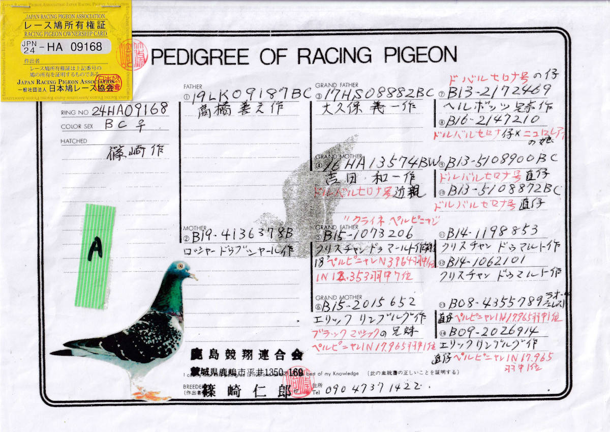 | 出品鳩「24HA09168 BC♀」篠崎仁郎作高橋作(ド・バルセロナ号孫×ドルバルセロナ近親孫)×R・プシャール作ペルヒニャンN優勝IN総合7位の娘鳩 | オークションNo: 1762649808 |