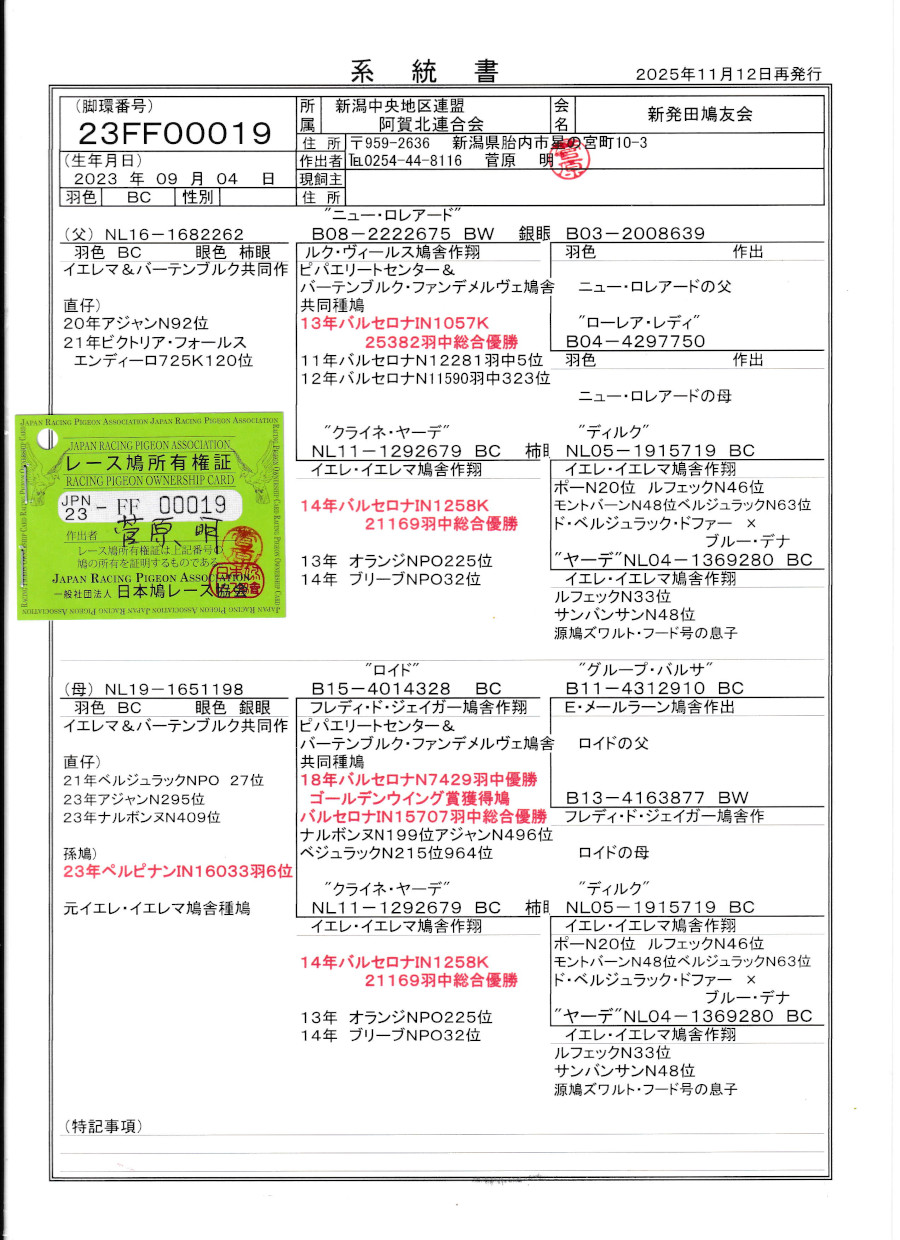 出品鳩♂23番「23FF00019 BC♂」菅原 明鳩舎作 両親イエレマ&バーテンブルグ鳩舎共同作 (ニューロレアート号13年バルセロナIN25382羽中総合優勝鳩直×クライネ・ヤーデ号14年バルセロナIN21169羽中総合優勝)直仔×イエレマ鳩舎元種鳩&孫鳩ペルピナンIN6位(ロイド号18年バルセロナIN15707羽中総合優勝×クライネ・ヤーデ号)娘鳩 との直仔です。 父親 「NL19−1682262BC」イエレマ&バーテンブルグ鳩舎共作 直仔にアジャンN92位鳩がいる ニューロレアート号13年バルセロナIN総合優勝&11年同N5位Xクライネヤーデ号バルセロナIN総合優勝鳩 同士の直仔です。 母親 「NL16−1651198BC」イエレマ&バーテンブルグ鳩舎共作 元イエレマ鳩舎種鳩 直仔にアシセャンN295位ナルボンヌN409位 孫鳩にもペルピナンIN16033羽中6位鳩がいる ロイド号18年バルセロナIN総合優勝&GW賞受賞Xクライネヤーデ号バルセロナIN総合優勝鳩 同士の直仔です。 詳しくは、添付の血統書の参照をお願いいたします。 <備考> 現在管理人の鳩舎で元気に過ごしています。写真は11/12日に撮影しました。 菅原明鳩舎の概要はこちらをご覧ください |