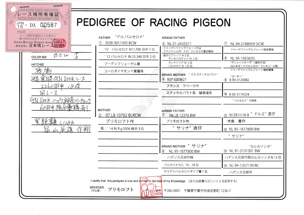 出品鳩1番「15DA00587 BCW ♂」プリモロフト作孫鳩に 24年東日本GN1128K2260羽総合18位ニュー神奈川ブロック60羽総合優勝鳩がいる ドル・バルセロナ号×サリナ号娘鳩 との直仔です。 父親 ”ドル・バルセロナ号”「B09−3011492 BCW」12年バルセロナN11706羽優勝IN25348羽総合2位 ユーロダイヤモンド賞獲得 ファンヘール・ドル&フレクィエ近親鳩×ミス・ステッケルバゥト号 との直仔です。 母親 「07LB10702 BLKCW」プリモロフト作 孫鳩にRG500K総合3位鳩がいる サリナ号直仔 ×サリナ号バルセロナIN3位他 との親息子掛け直仔です。 詳しくは、添付の血統書の参照をお願いいたします。 <備考> 現在管理人の鳩舎で元気に過ごしています。写真は11/15日に撮影しました。 菅原明鳩舎の概要はこちらをご覧ください |