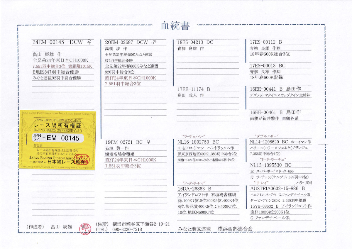 出品鳩21番「24EM00145 DCW♀」畠山辰雄鳩舎作 金剛力号24年東日本CH7551羽中総合3位E地区847羽中総合優勝鳩の全兄弟鳩 ![]() |