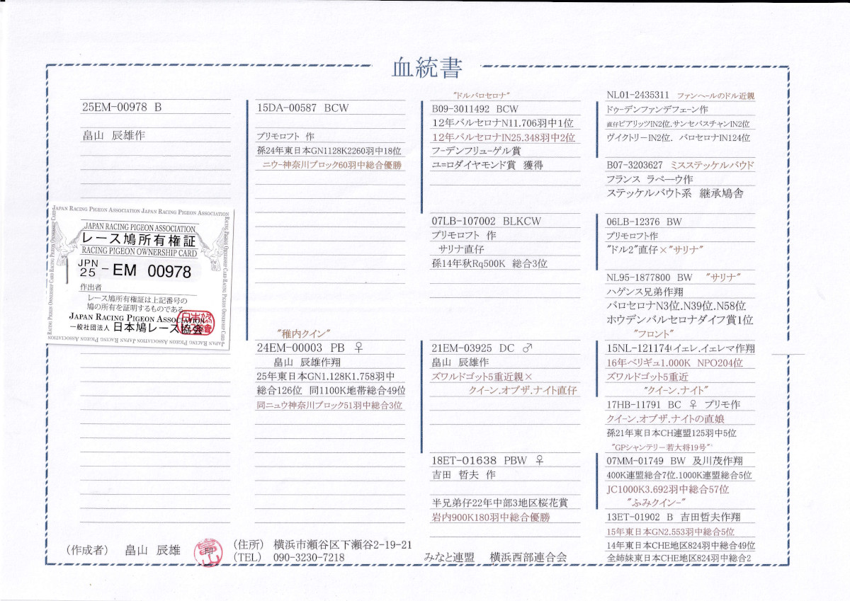 出品鳩32番「25EM00978 B」畠山辰雄作プリモ作(ドル・バルセロナ号×サリナ号娘)直仔×稚内クイン号25年東日本GN総合126位ブロック総合3位 ![]() |