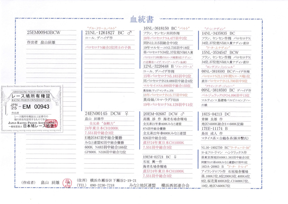 出品鳩28番「25EM00943 BCW」畠山辰雄鳩舎作コールデハイデ作(20年バルセロナN2位IN3位×15年バルセロナN2位IN4位)直仔×金剛力号24年東日本CH7551羽中総合3位の全兄弟鳩 との直仔です。 父親 "ブルードリームバルト号"「NL21−1261827 BC」コール・デハイデ鳩舎作 バルト号20年バルセロナN2位IN3位×ブルードリーム号15年バルセロナN2位IN4位鳩 との直仔です。 母親 21番「24EM00145 DCW ♀」畠山辰雄鳩舎作 金剛力号24年東日本CH7551羽中総合3位E地区847羽中総合優勝鳩の全兄弟鳩で 400K総合優勝600K総合3位全兄弟×(ハリー孫×リーレイ号280k2558羽優勝の娘)娘鳩 との直仔です。 詳しくは、添付の血統書の参照をお願いいたします。 <備考> 現在管理人の鳩舎で元気に過ごしています。写真は11/15日に撮影しました。 菅原明鳩舎の概要はこちらをご覧ください |
