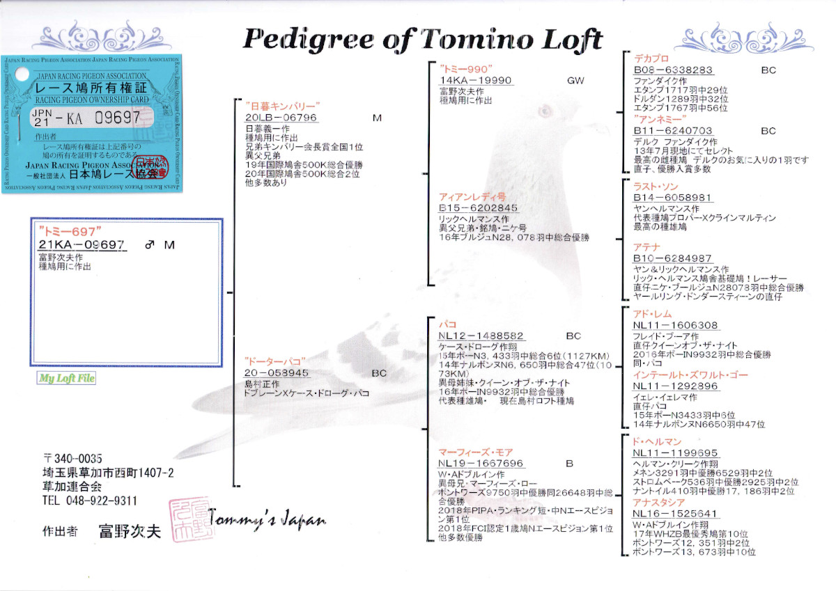 出品鳩"トミー697号"「21KA09697 M ♂」富野次夫鳩舎作 日暮キンバリー号(キンバリー号会長賞全国1位全兄弟鳩) ×島村作パコ号ケースドローグ作翔ポーN3433羽総合6位の娘鳩 との直仔です。 父親 "日暮キンバリー号"「20LB06796 M」日暮義一鳩舎種用作 兄弟に キンバリー号会長賞全国1位鳩 異父兄弟に国際500K総合優勝総合2位鳩がいる トミー990号(デカプロ号×アンネミ号)×アイアンレディ号(ニケ号ブールジュN28078羽総合優勝の異父兄弟)との直仔です。 母親 ”ドーターパコ号”「20−058945 BC」島村 正鳩舎作 パコ号ケースドローグ作翔ポーN3433羽総合6位(異母姉クインオブザナイト号)×マーフィーズ・モア号ドブレイン作マーフィーズ・ロー号セニセチランキングング短中距離AP1位鳩の異母兄弟(ドヘルマン×アナスタシア)鳩 との直仔です。 詳しくは、血統書を参照してください。 <備考> 現在管理人の鳩舎で元気に暮らしています。写真11/15日に撮影しました。 菅原明鳩舎の概要はこちらをご覧ください |