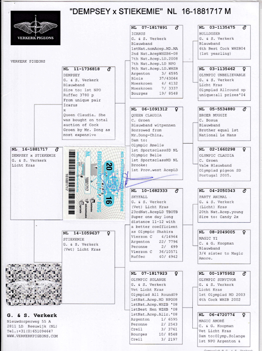 出品鳩「NL16−1881717 BC♂」G&Sフェルケルク鳩舎作 異母兄弟にルフェツクNPO3780羽中優勝鳩がいる イカラス号NエースP2位7位直仔×オリンピックソランジェ号オリンピアードオールラウンド1位の娘鳩 との直仔です。 父親 "デンプスィ号"「NL11−1736818 B」G&Sフェルケルク鳩舎作 直仔にルフェツクNPO3780羽中優勝鳩がいる イカラス号NエースP2位7位×クィーン・クラウディア号 との直仔です。 母親 ”スティークミー号”「NL14−1059637 BC」G&Sフェルケルク鳩舎作 スカイフォール号ヴィエルゾン14964羽4位10571羽36位 ×オリンピックソランジェ号オリンピアードオールラウンド1位鳩 との直仔です。 詳しくは、血統書を参照してください。 <備考> 現在管理人の鳩舎で元気に暮らしています。写真11/15日に撮影しました。 菅原明鳩舎の概要はこちらをご覧ください |