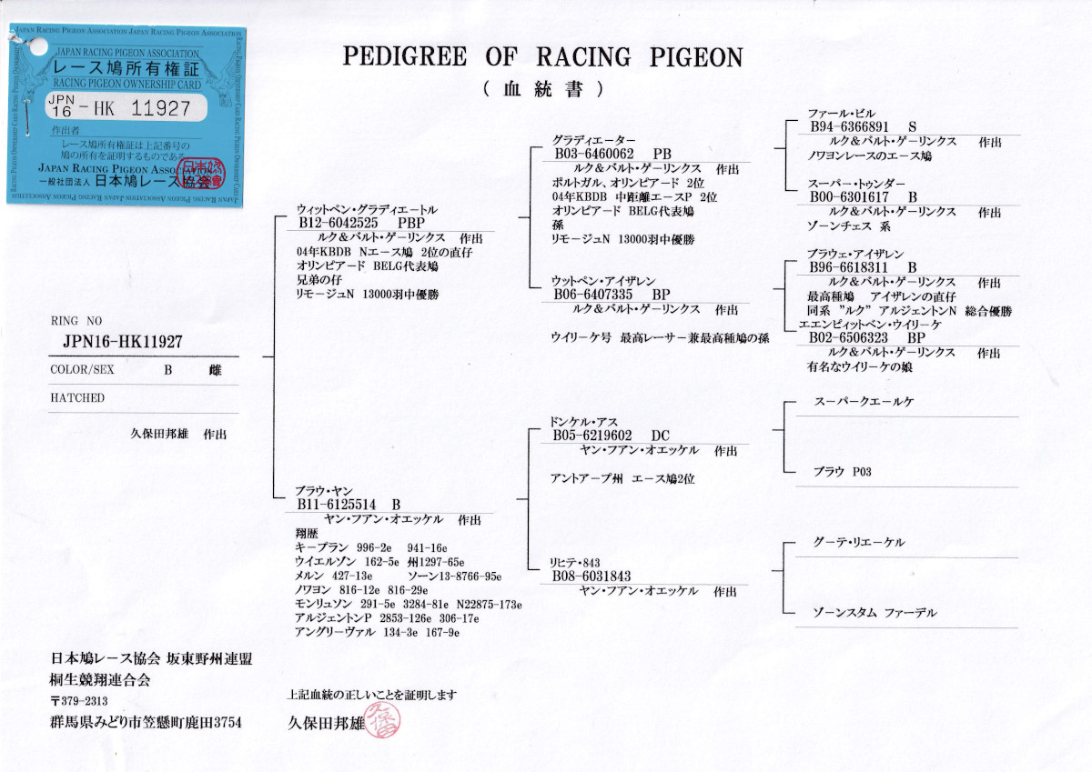 出品鳩「16HK11927 B♀」久保田作 グラディエーター号KBDB中距離AP賞2位直仔×オッケル作翔キープラン996羽2位941羽16位モンリュソンN22875羽173位 ![]() |