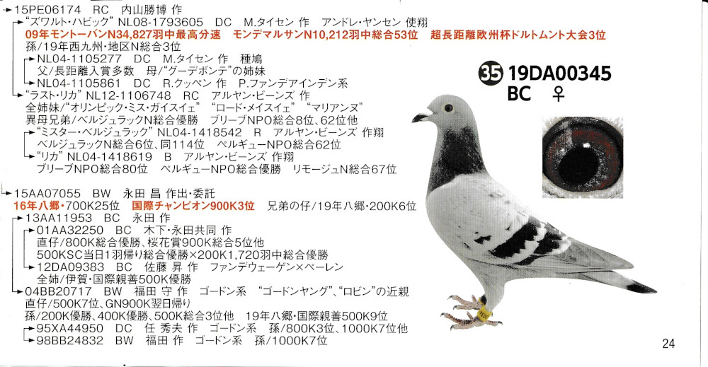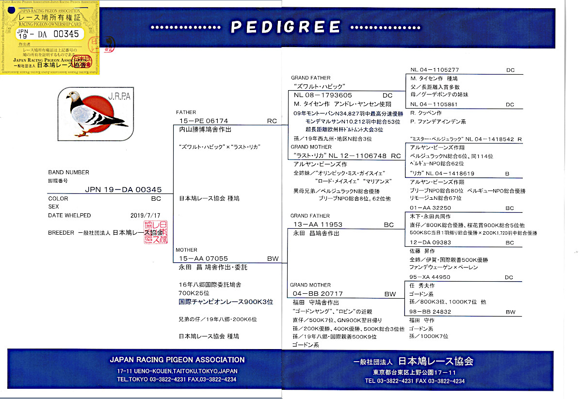 出品鳩「19DA00345 BC ♀」日本鳩レース協会作内山作(ズワルトハビック号モントバーンN総合優勝 ×A・ビーンズ作オリンピックミスハイシェ号全姉妹)直仔×16年八郷国際CH900K全国3位鳩との直仔です。 父親 「15PE06174 RC」内山勝博鳩舎作 ズワルトハビック号モントバーンN34827羽中総合優勝 ×A・ビーンズ作ラスト・リカ号(オリンピックミスハイシェ号全姉妹)との直仔です。 母親 「15AA07055 BW」永田 昌鳩舎作委託 16年八郷国際オリエンタルカップ700k25位 CH900K全国3位鳩で 800K総合優勝の半兄弟×ゴートン系鳩 との直仔です。 詳しくは、血統書を参照してください。 <備考> 現在管理人の鳩舎で元気に暮らしています。写真11/15日に撮影しました。 菅原明鳩舎の概要はこちらをご覧ください |