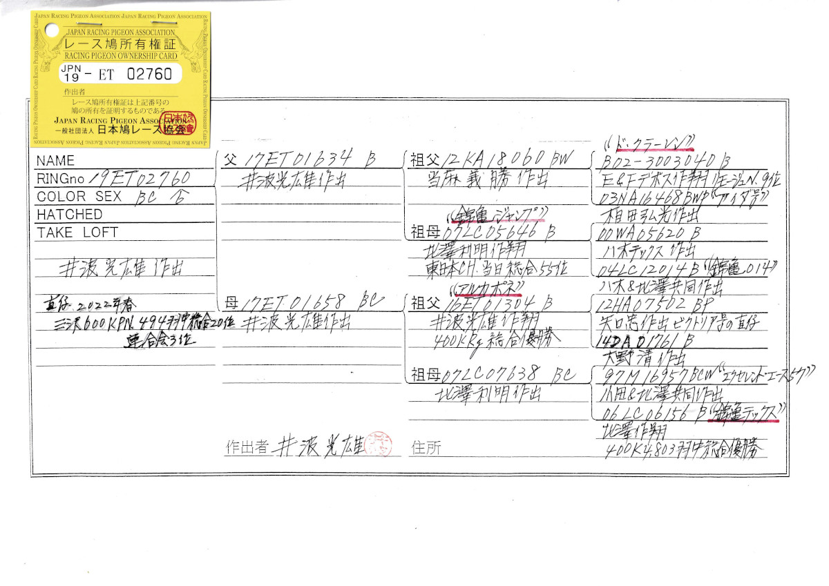 出品鳩「19ET02760 BC♂」井波光雄作直仔)地区N総合20位 錦亀ジャンプ号東日本CH総合55位直仔×アネカポネ号ブロック400k総合優勝の娘鳩 ![]() |
