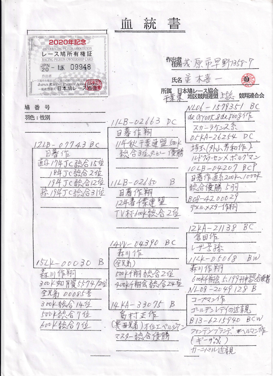 出品鳩「20LK09948 BC」並木喜一作異母兄弟)JC総合2位12位15位(秋500K総合3位×千葉テレビ杯総合2位)×300K如月賞5574羽総合2位 ![]() |