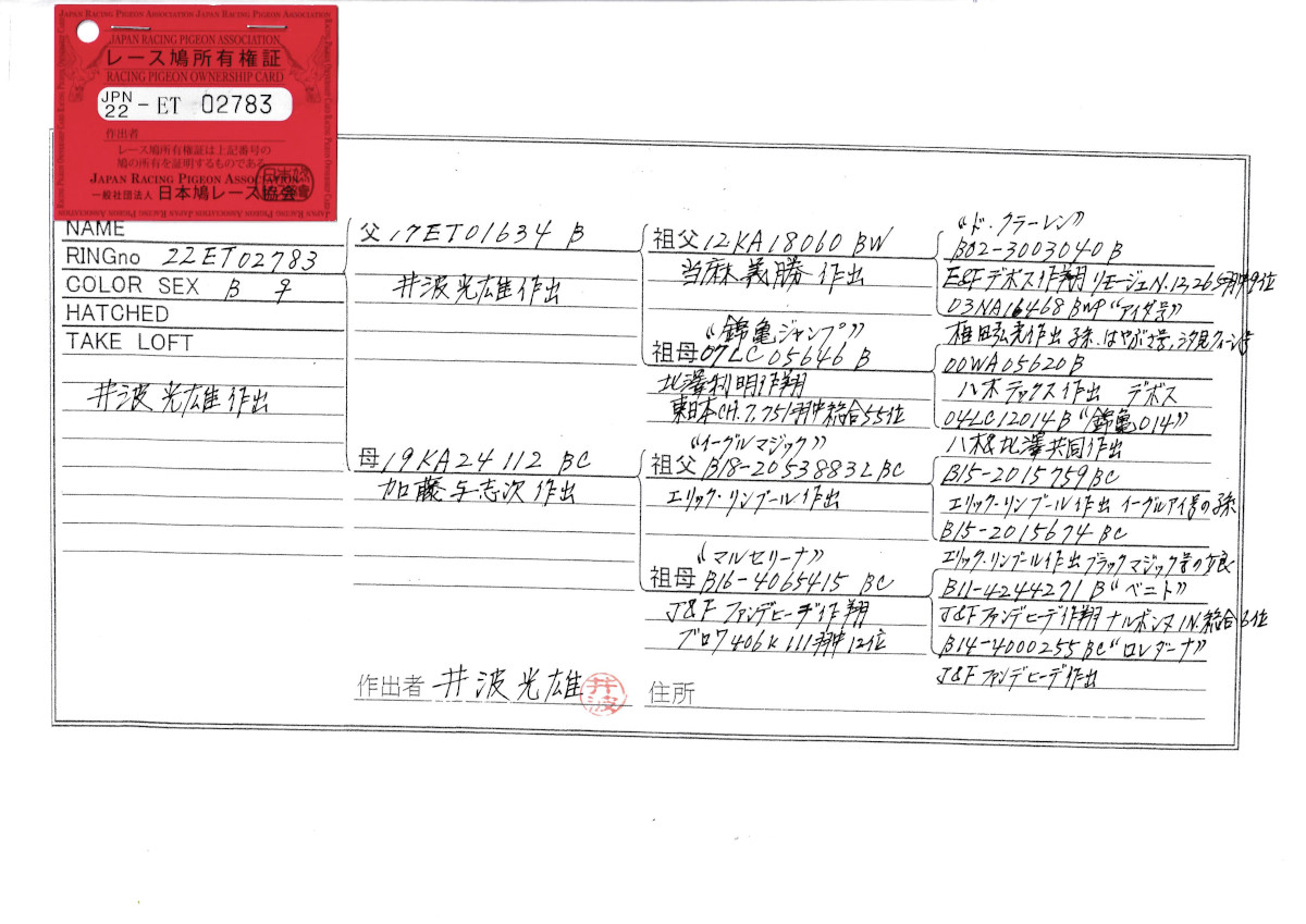 出品鳩「22ET02783 B♀」井波光雄作 錦亀ジャンプ号東日本CH総合55位直仔×(ブラックマジック孫×ファンデヒーデ作ベニト号ナルボンヌN6位の娘) ![]() |