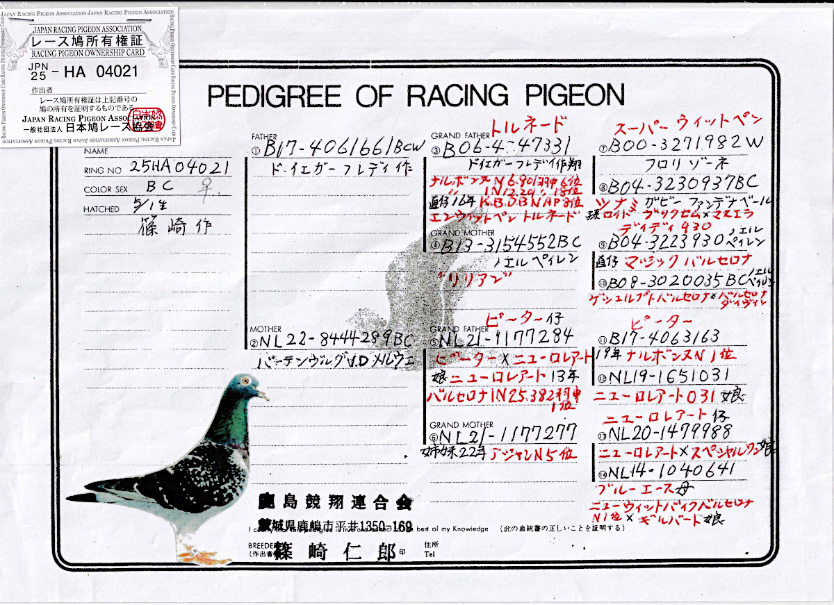 出品鳩若20番「25HA04021 BC」篠崎作ドイエガーフレディ作KBDB長距離NatAP8位半兄弟×バーテンブルグ作ナルボンヌN優勝孫&ニューロレアート近親 ![]() |