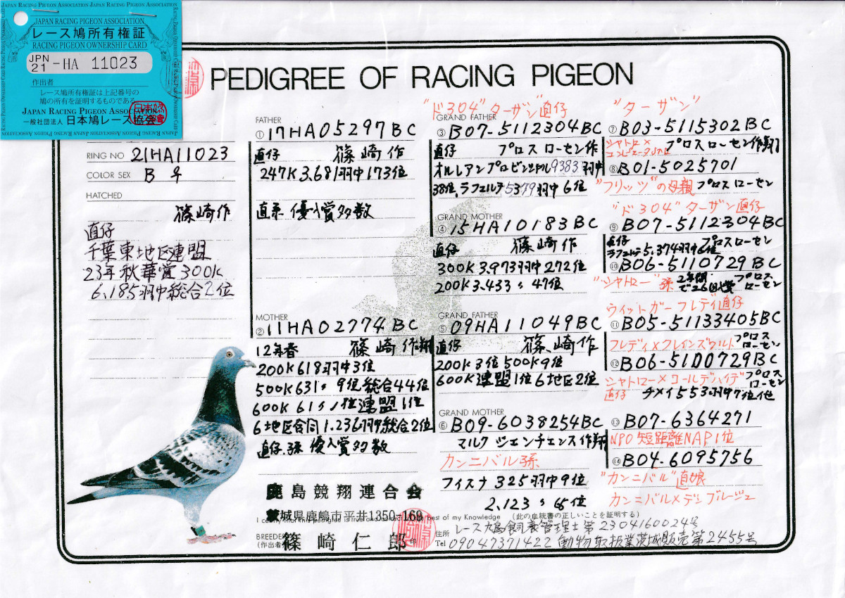 出品鳩♀12番「21HA11023 B♀」篠崎仁郎作直仔)秋華賞300k6186羽総合2位ラフェルテ6位半兄弟(ターザン直仔×ターザン孫)×6地区600K総合2位 ![]() |