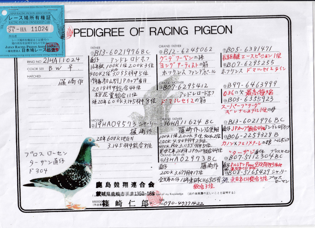 出品鳩♀13番「21HA11024 BW♀」篠崎仁郎作半兄弟)RG総合5位JC総合44位桜花賞総合11位A・ロードホフ作×地区N3145羽中総合8位 ![]() |