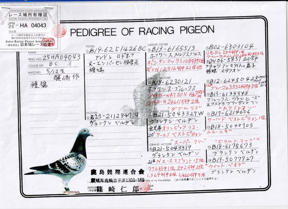 出品鳩若42番「25HA04043 BC」篠崎仁郎作ロードホフ作シャトローNZ7980羽中優勝同N2位直仔×ヘルボッツ作オリンピックリコ号全兄弟の娘 ![]() |