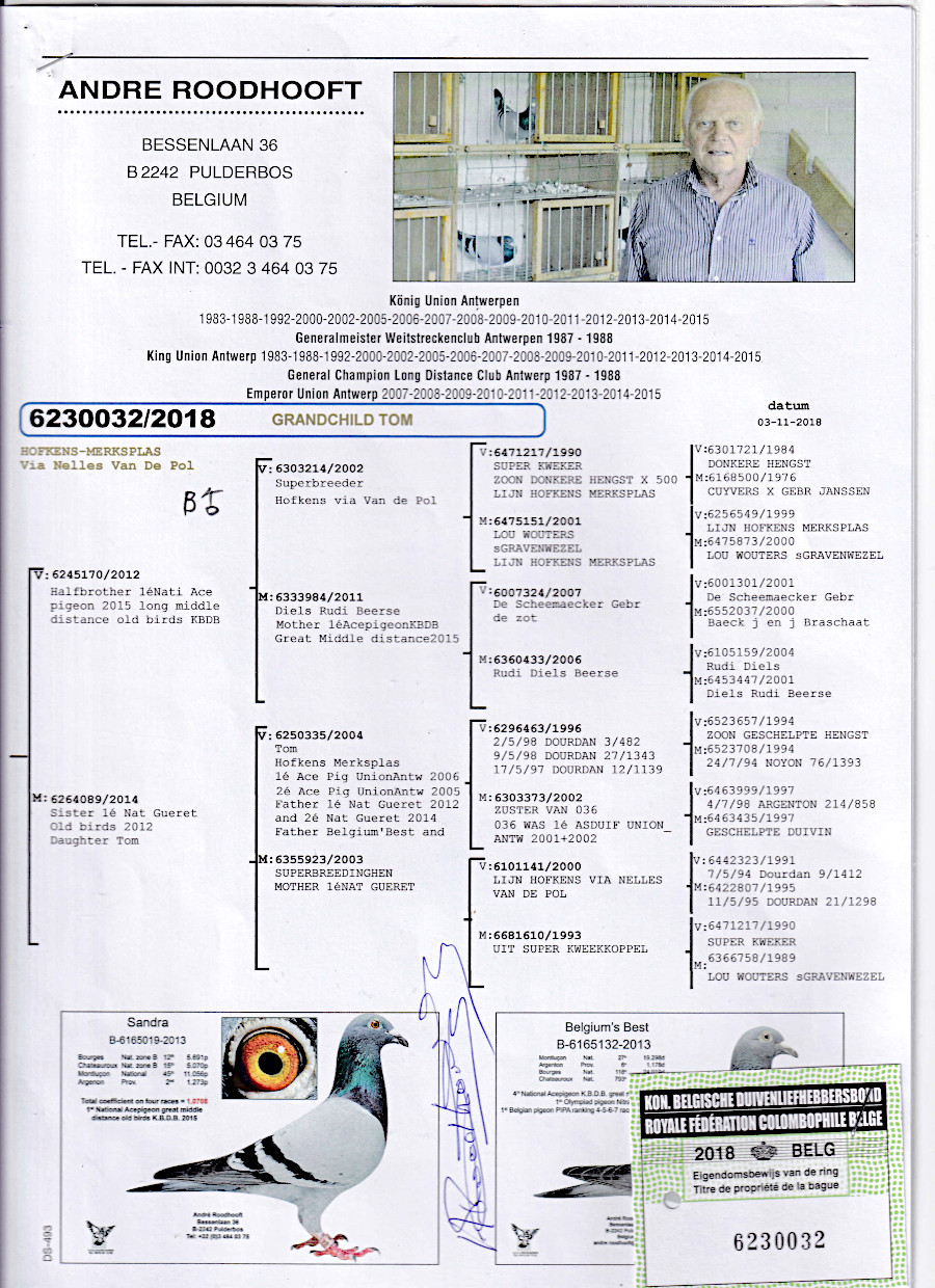 出品鳩♂3番「B18−6230032 B ♂」A・ロードホフ鳩舎作 KBDB中距離NatAP1位の異母兄弟×ギレN成鳩1位姉妹鳩&銘鳩トム号06年アントワープユニオンAP1位05年2位の娘鳩 との直仔です。 父親 「B12−6245170」Aロードホフ鳩舎作 異父兄弟に KBDB中距離NatAP1位鳩がいる スーパーブリダー(ホフケンス・ファンデポール系)×デイールスルディ・ビールセ(ギレN12516羽中21位ポンサンマックス108羽中優勝鳩) との直仔です。 母親 「B14−6264089」Aロードホフ鳩舎作 姉妹鳩にギレN成鳩1位鳩 異母兄弟に オリンピアード1位鳩がいる 銘鳩トム号06年アントワープユニオンAP1位05年2位鳩の娘鳩です。 詳しくは、血統書を参照してください。 <備考> 現在管理人の鳩舎で元気に暮らしています。写真12/20日に撮影しました。 菅原明鳩舎の概要はこちらをご覧ください |