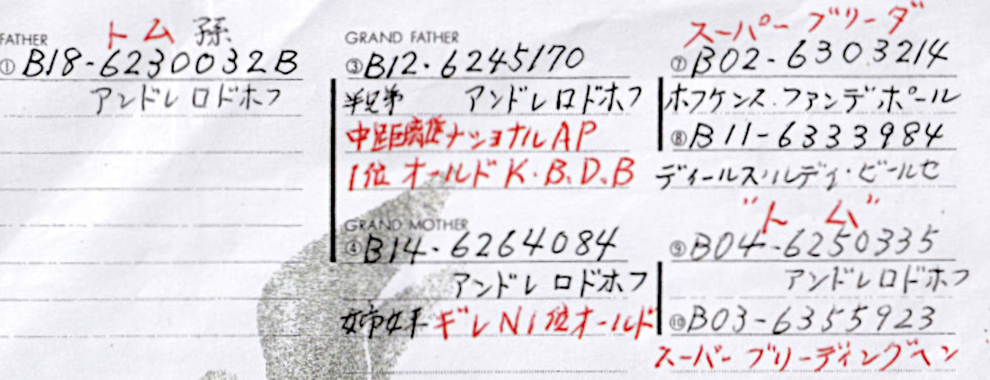 出品鳩♂3番「B18−6230032 B♂」A・ロードホフ作 KBDB中距離NatAP1位の異母兄弟×ギレN成鳩1位姉妹鳩&銘鳩トム号の娘鳩 ![]() |