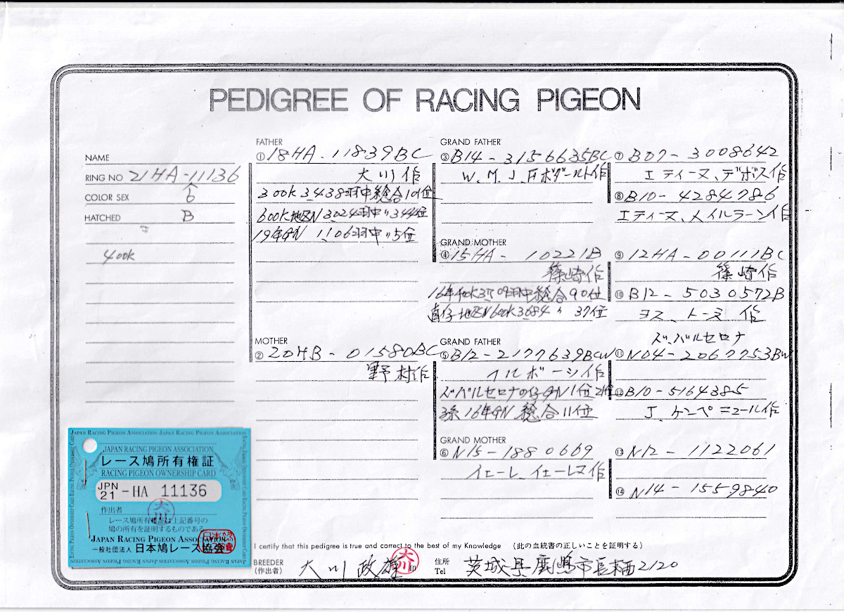 出品鳩♂14番「21HA11136 B♂」大川政雄作翔400K 19年東日本GN1106羽中総合5位×ドバルセロナ号キバルセロナN総合優勝の孫 ![]() |