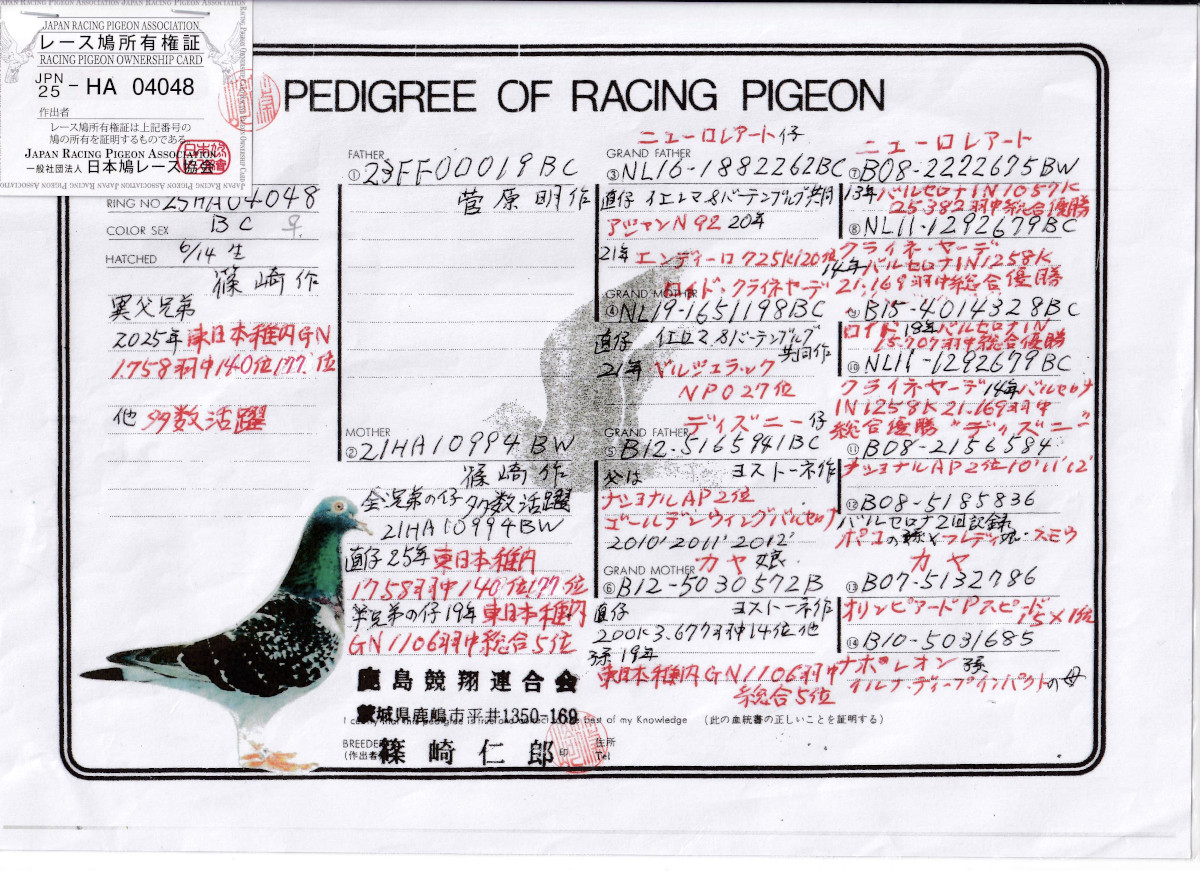 出品鳩若47番「25HA04048 BC」篠崎仁郎鳩舎作 異父兄弟に東日本GN1758羽中総合140位177位鳩がいる 菅原作(ニュロレアード/クライネヤーデ×ロイド/クライネヤーデ)直仔×両親ヨストーネ作(ディズニー号の直仔×カヤ号娘)娘鳩 との直仔です。 父親 ♂23番「23FF00019 BC♂」菅原 明鳩舎作 両親イエレマ&バーテンブルグ鳩舎共同作 (ニューロレアート号13年バルセロナIN25382羽中総合優勝鳩直×クライネ・ヤーデ号14年バルセロナIN21169羽中総合優勝)直仔×イエレマ鳩舎元種鳩&孫鳩ペルピナンIN6位(ロイド号18年バルセロナIN15707羽中総合優勝×クライネ・ヤーデ号)娘鳩 との直仔です。 母親 ♂12番「21HA10994 BW ♀」篠崎仁郎鳩舎作直仔に東日本GN1758羽中総合140位177位鳩がいる 両親ヨストーネ作ディズニー号GWバルセロナN3年間AP2位バルセロナN24位134位の直仔×カヤ号オリンピアードP スピード15回優勝の娘鳩 との直仔です。 詳しくは、血統書を参照してください。 <備考> 現在管理人の鳩舎で元気に暮らしています。写真12/20日に撮影しました。 菅原明鳩舎の概要はこちらをご覧ください |