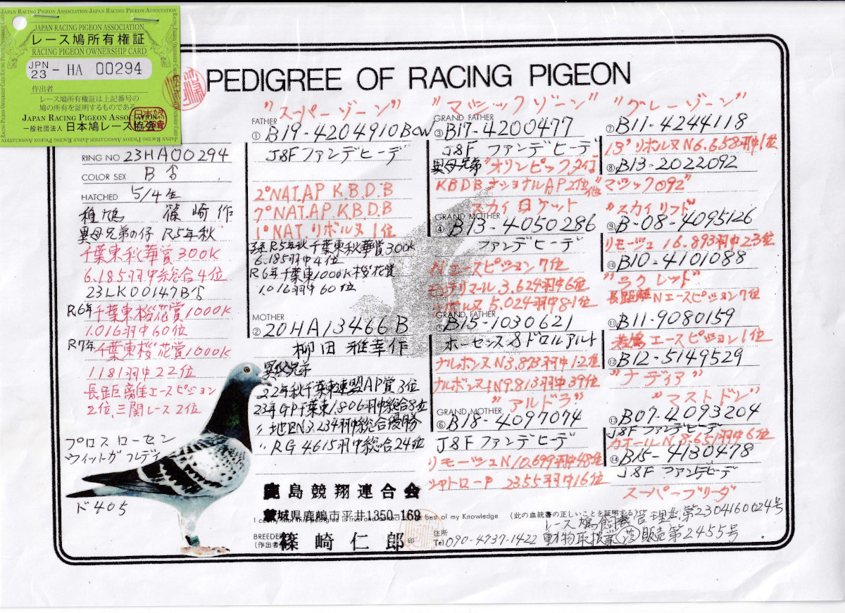 出品鳩♂26番「23HA00294 B♂」篠崎仁郎作ファンデヒーデ作スカイロケット号KBDB-Nエース7位直仔×柳田作地区N総合優勝GP総合8位半兄弟 ![]() |