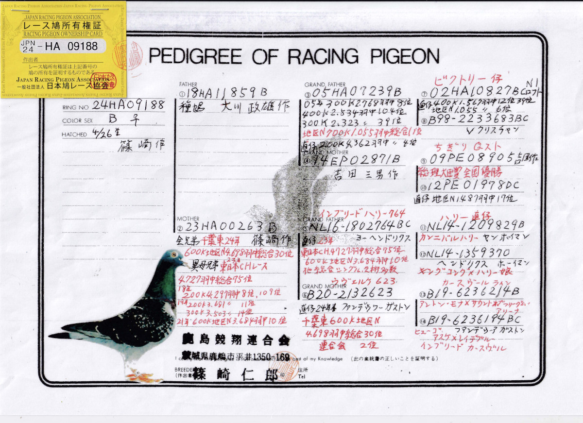 出品鳩♀28番「24HA09188 B ♀」篠崎仁郎鳩舎作大川作(地区N700K1055羽中総合優勝×吉田作ちぎりQスト号総理大臣賞全国優勝の娘)直仔×(インブリート・ハリー764号ハリー号近親孫×ガストン作カースヴール号近親)娘鳩 との直仔です。 父親 ♂6番「18HA11859 B」大川政雄鳩舎作 異母兄弟に200K4362羽中総合4位鳩がいる 地区N700K1055羽中総合優勝(ヤンセン系ビクトリー号孫)×吉田作ちぎりQスト号総理大臣賞全国優勝の娘鳩 との直仔です。地区N総合優勝ビクトリー号の孫X吉田作ちぎりQスト号総理大臣賞全国優勝の娘鳩 との直仔です。 母親 ♀22番「23HA00263 B」篠崎仁郎鳩舎作 全兄弟に地区N4698羽中総合30位鳩 異母兄弟に東日本CH総合75位鳩がいる インブリート・ハリー764号(ハリー号近親孫)×ガストン作カースヴール号近親鳩 との直仔です。 詳しくは、血統書を参照してください。 <備考> 現在管理人の鳩舎で元気に暮らしています。写真12/12日に撮影しました。 菅原明鳩舎の概要はこちらをご覧ください |
