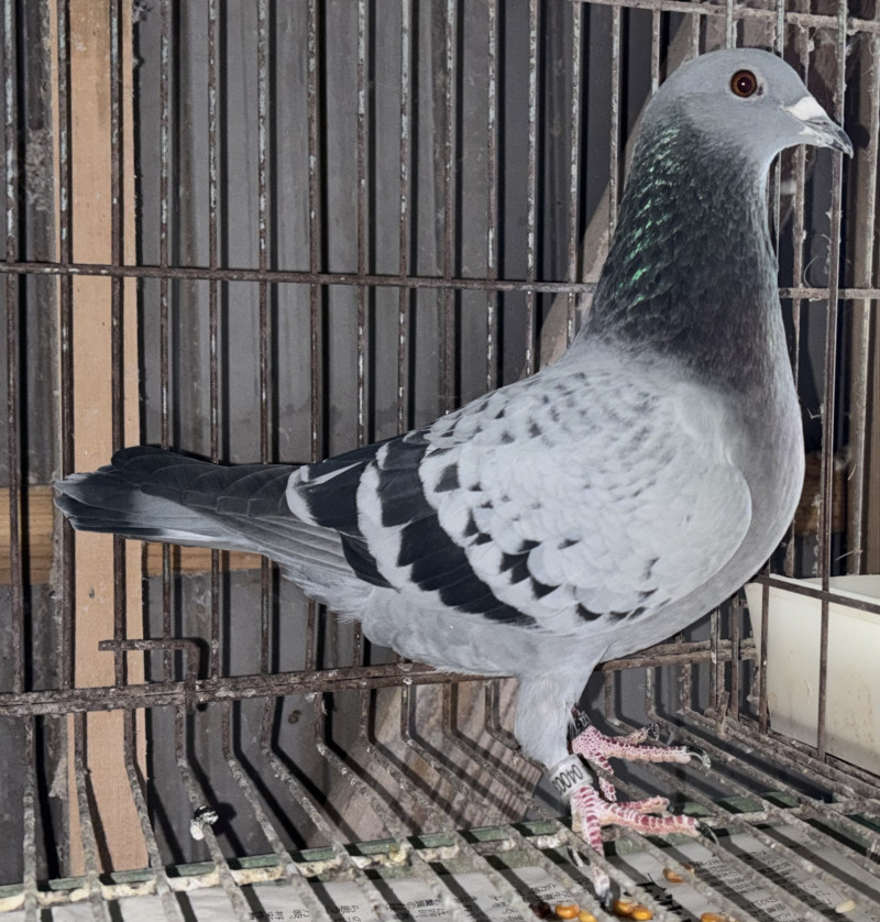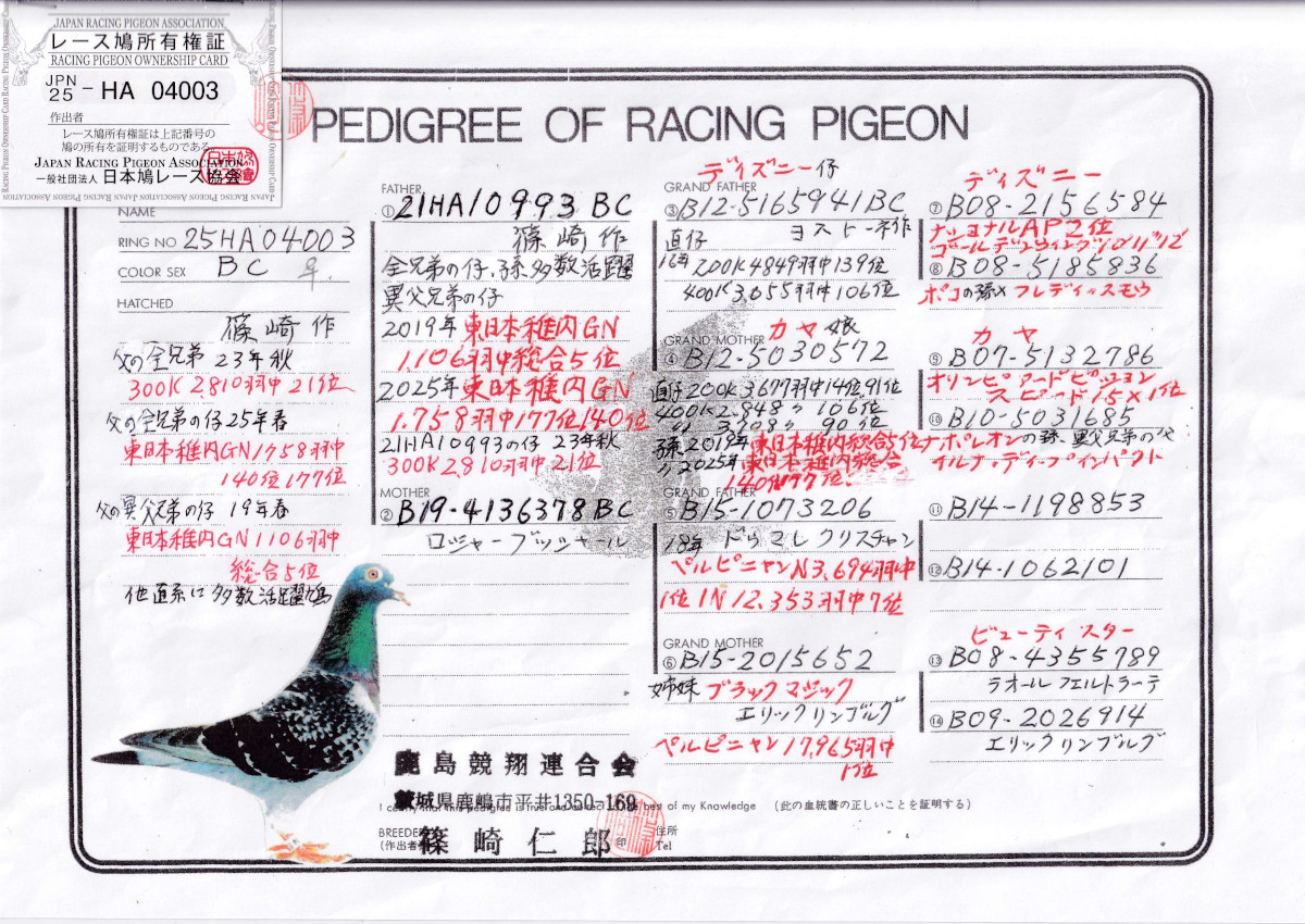 出品鳩若3番「25HA04003 BC」篠崎作両親ヨストーネ作(ディズニー号GWバルセロナN3年AP2位直仔×カヤ号オリンピアードP娘)×プシャール作ペルピナンN優勝娘鳩 ![]() |