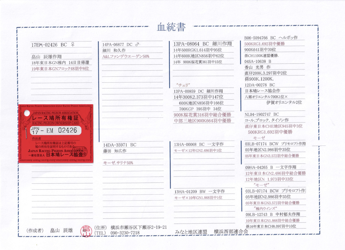 出品鳩3番「17EM02426 BC♀」畠山辰雄作翔18年GN14日目19年GNブ゜ロック総合8位 桜花賞中部三地区総合優勝直仔×祖父母4羽GN総合優勝 ![]() |