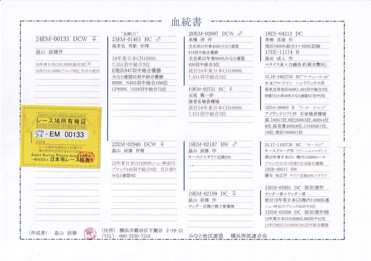 出品鳩19番「24EM00133 DCW♀」畠山辰雄作金剛力号24年東日本CH総合3位E地区総合優勝×23年東日本CHブロツク440羽総合8位 ![]() |