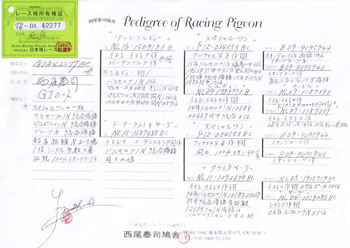 出品鳩5番「18DA42277 B ♂」西尾泰司鳩舎作両親イエレマ&バーテンブルグ鳩舎共同作(スペシャルワン号×シルビィ号)バルセロナIN(1位×3位)ペアー直仔×(スペシャルワン号×クライネヤーデ号)バルセロナIN(1位×1位)ペアー娘鳩 との直仔です。 父親 "ゾーンシルビー号"「NL16−1509183 B」イエレマ&バーテンブルグ鳩舎共同作 スペシャルワン号15年バルセロナIN19038羽総合優勝×シルビィ号14年バルセロナIN20669羽総合3位鳩 との直仔です。 母親 "ドータークライネヤーデ号"「NL15−1687688 BC」イエレマ&バーテンブルグ鳩舎共同作 スペシャルワン号15年バルセロナIN19038羽総合優勝×クライネヤーデ号14年バルセロナIN20669羽総合優勝鳩 との直仔です。 詳しくは、添付の血統書の参照をお願いいたします。 <備考> 現在管理人の鳩舎で元気に過ごしています。写真は11/22日に撮影しました。 菅原明鳩舎の概要はこちらをご覧ください |