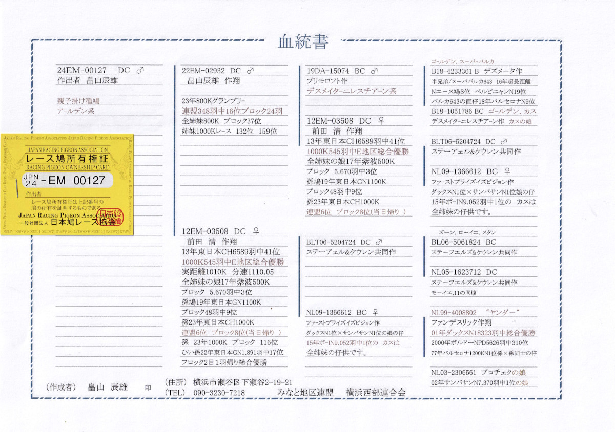 出品鳩17番「24EM00127 DC♂」畠山辰雄作GP800K連盟348羽16位総合24位×東日本CH6589羽41位E地区545羽優勝鳩(親息子交配) ![]() |
