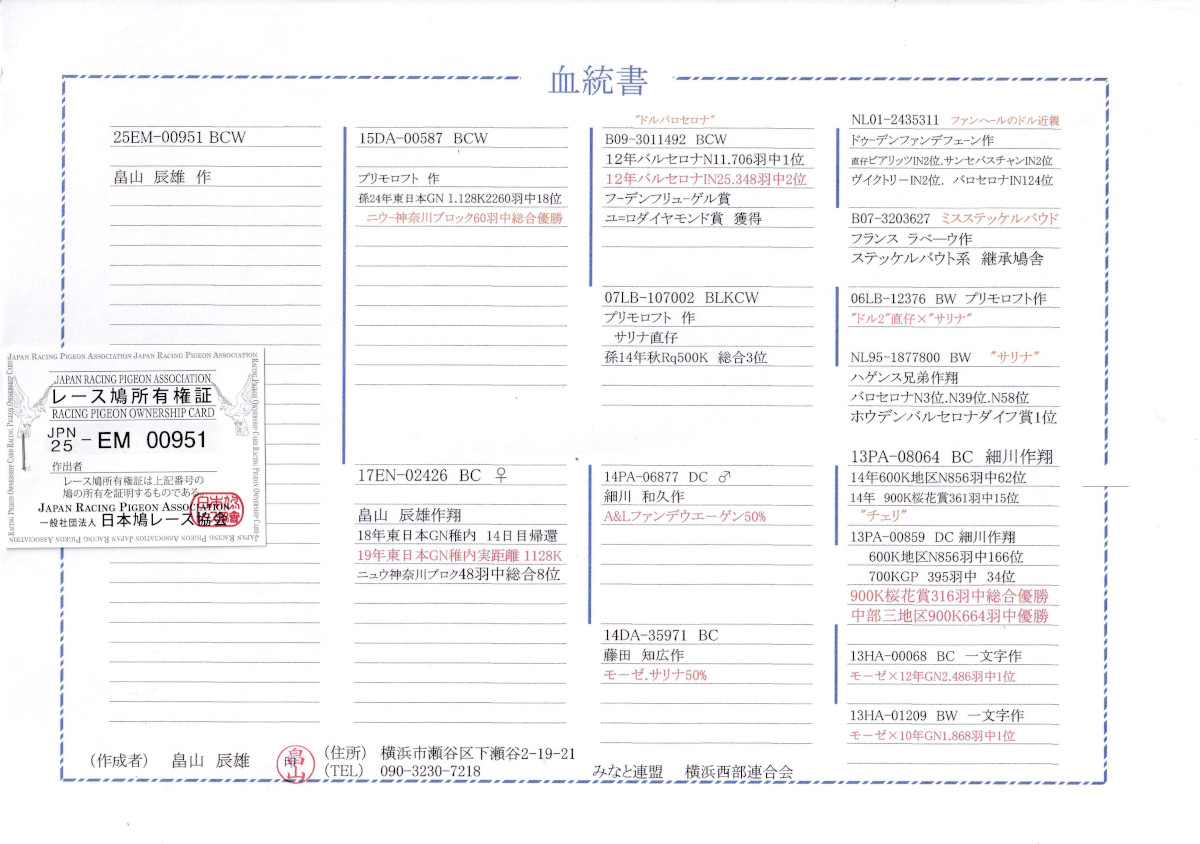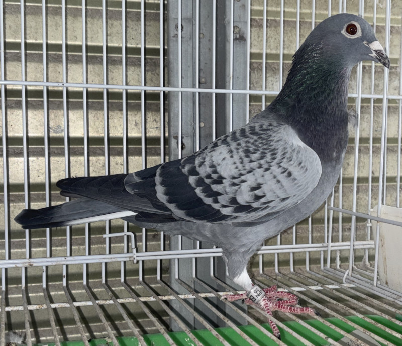 出品鳩31番「25EM00951 BCW」畠山辰雄鳩舎作プリモロフト作(ドル・バルセロナ号×サリナ号娘)直仔×18年東日本GN14日目帰還19年東日本GNブロック総合8位鳩 との直仔です。 父親 1番「15DA00587 BCW ♂」プリモロフト作 孫鳩に 24年東日本GN1128K2260羽総合18位ニュー神奈川ブロック60羽総合優勝鳩がいる ドル・バルセロナ号×サリナ号娘鳩 との直仔です。 母親 3番「17EM02426 BC ♀」畠山辰雄鳩舎作翔 18年東日本GN14日目帰還19年東日本GNブロック総合8位鳩で 50%ファンデ・ウエーゲン系チェリ号桜花賞900K316羽総合優勝中部三地区900K664羽優勝の直仔×両親一文字作(モーゼ号/GN総合優勝×モーゼ号/GN総合優勝)娘鳩 との直仔です。 詳しくは、添付の血統書の参照をお願いいたします。 <備考> 現在管理人の鳩舎で元気に過ごしています。写真は11/22日に撮影しました。 菅原明鳩舎の概要はこちらをご覧ください |
