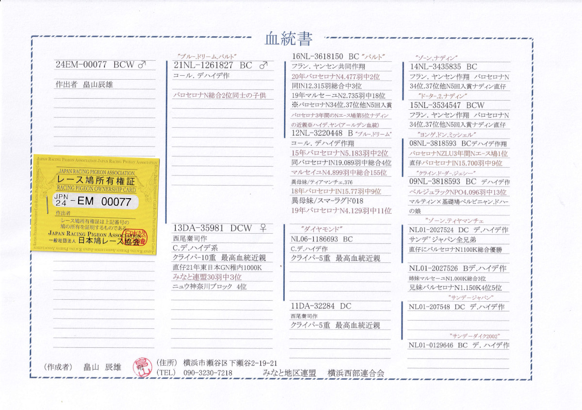 出品鳩16番「24EM00077 BCW♂」畠山辰雄作半兄弟)東日本稚内GNブロック4位純コールデハイデ系(バルセロナIN3位×同IN4位)×クランパー10重近親 ![]() |