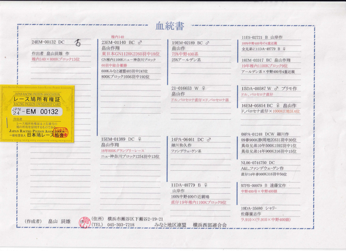 出品鳩18番「24EM00132 BC♂」畠山辰雄鳩舎稚内140号東日本GN2260羽総合18位プロック総合優勝×GP800Kブロック1254羽総合13位 ![]() |