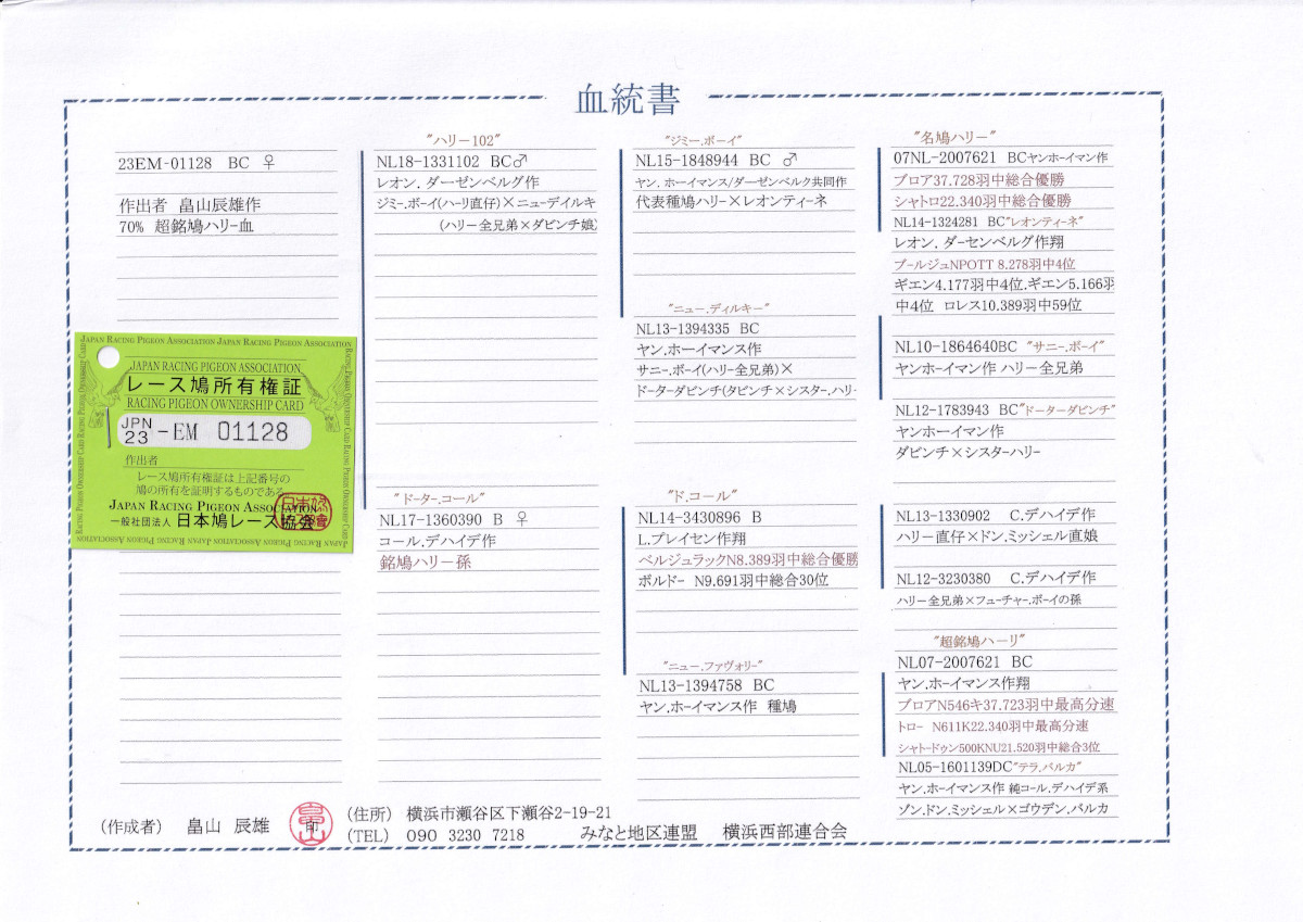 出品鳩14番「23EM01128 BC♀」畠山辰雄作純ホーイマン系銘鳩ハリー号孫×コールデハイデ作(ド・コール号ベルジュラックN総合優勝×超銘鳩ハリー号娘) ![]() |