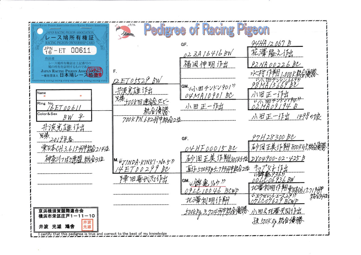 出品鳩「16ET00611 BW♀」井波光雄作兄弟)東日本CH連盟3位総合214位小田チンドン系PN総合2位兄弟鳩×錦亀リョウ号RG500K総合優勝の娘 ![]() |
