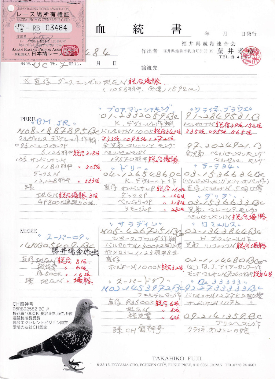 出品鳩「15RB03484 BC♀」藤井孝彦作直仔)地区N総合優勝半兄弟)PN総合8位桜花賞総合6位 BM・JR号サンバンサンN305位他×スーパードイフ号娘 ![]() |