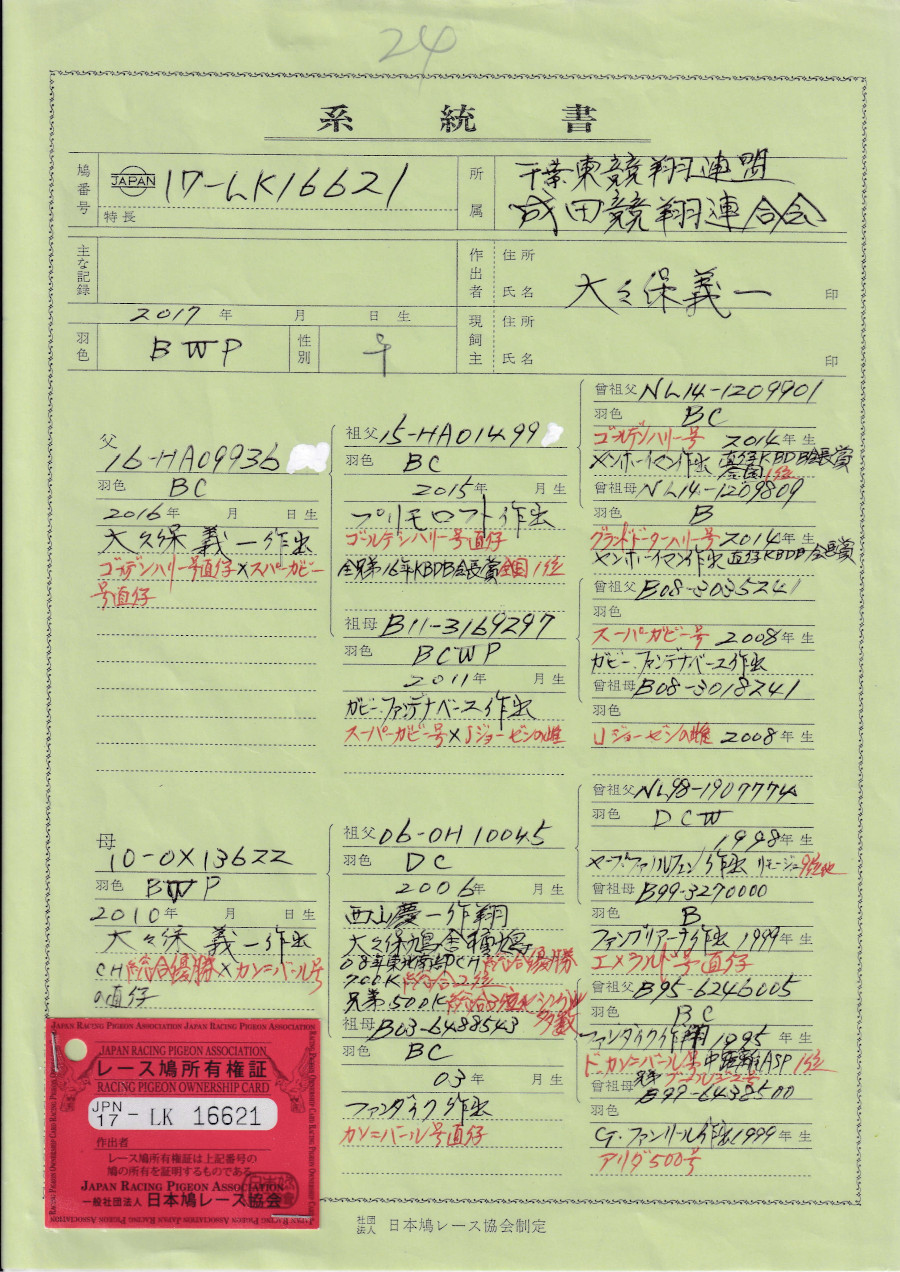 出品鳩「17LK16621 BWP♀」大久保義一作(プリモ作KBDB会長賞全国1位全兄弟×スーパーカビー号娘)×(西山作翔東北南部CH総合優勝×カンニバル号娘) ![]() |