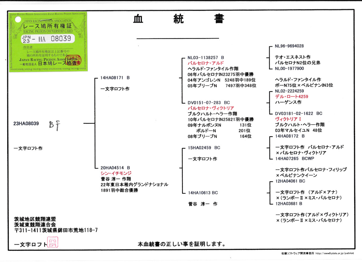 出品鳩成1番「23HA08039 B♀」一文字作新イチモンジ号菅谷作翔22年東日本稚内GN1891羽総合優勝の直仔 (アルド×ビクトリア)4重近親 ![]() |
