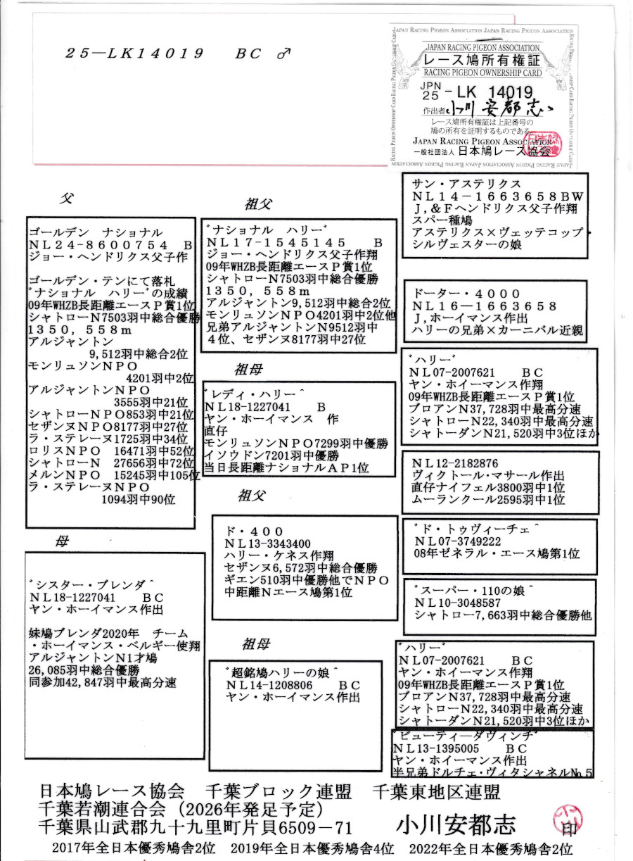 出品鳩若20番「25LK14019 BC」小川安都志作ナショナルハリー号WHZB長距離AP1位シャトローN優勝直仔×ブレンダー号(アルジェントン一歳N総合優勝)姉妹 ![]() |