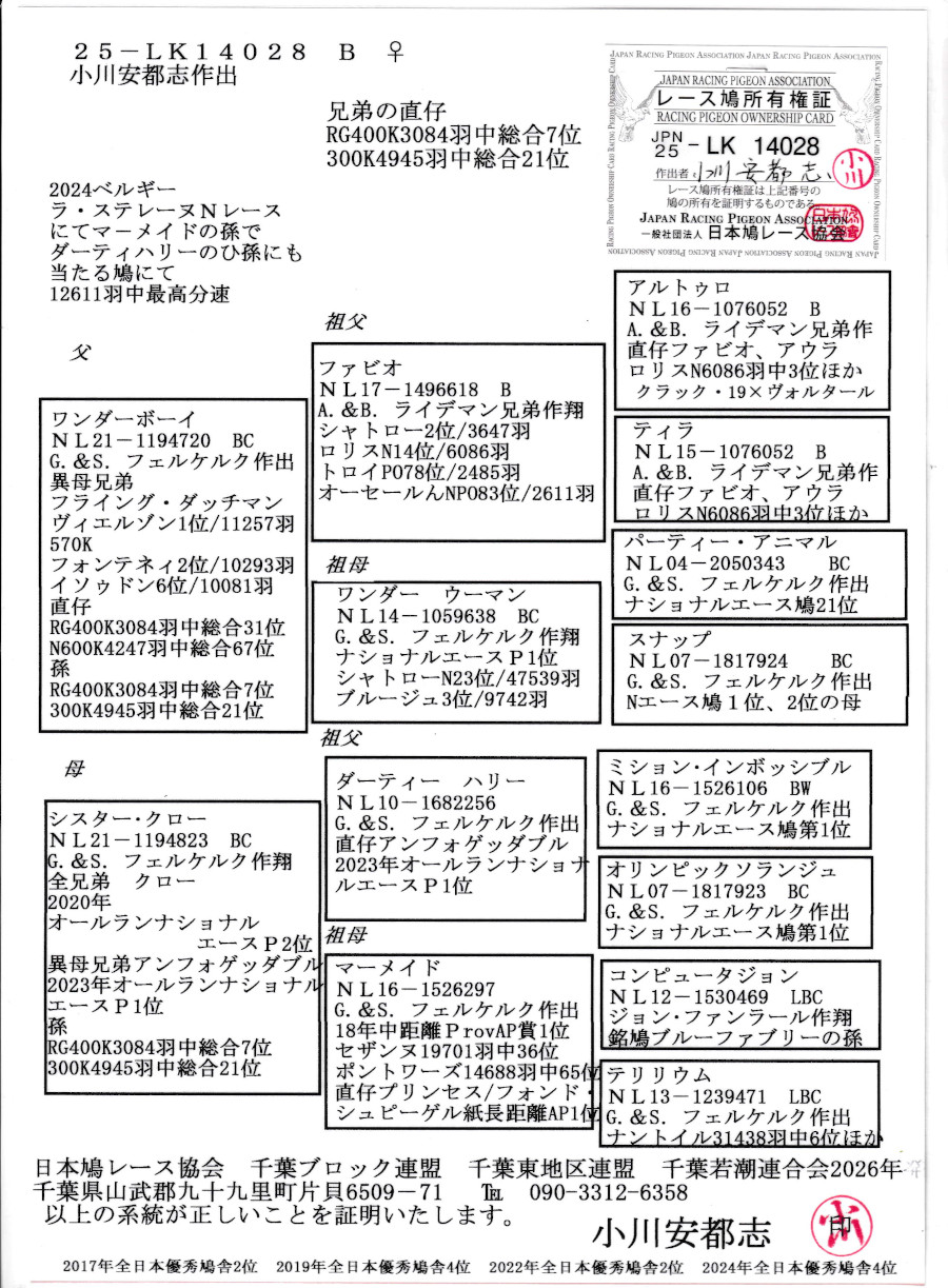 出品鳩若24番「25LK14028 B」小川作半兄弟)RG総合31位地区N総合67位鳩両親フェルケルク作NエースP1位の直仔×オリンピックソランジエ号孫鳩 ![]() |