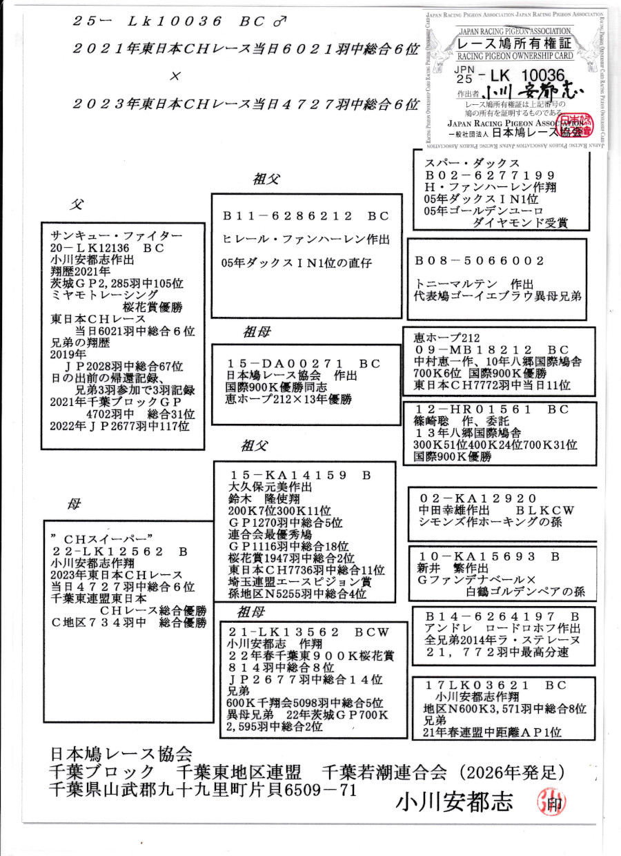 出品鳩若8番「25LK10036 BC」小川安都志作サンキュウファイター号桜花賞優勝東日本CH総合6位×CHスイーパー号東日本CH総合6位C地区総合優勝鳩 ![]() |