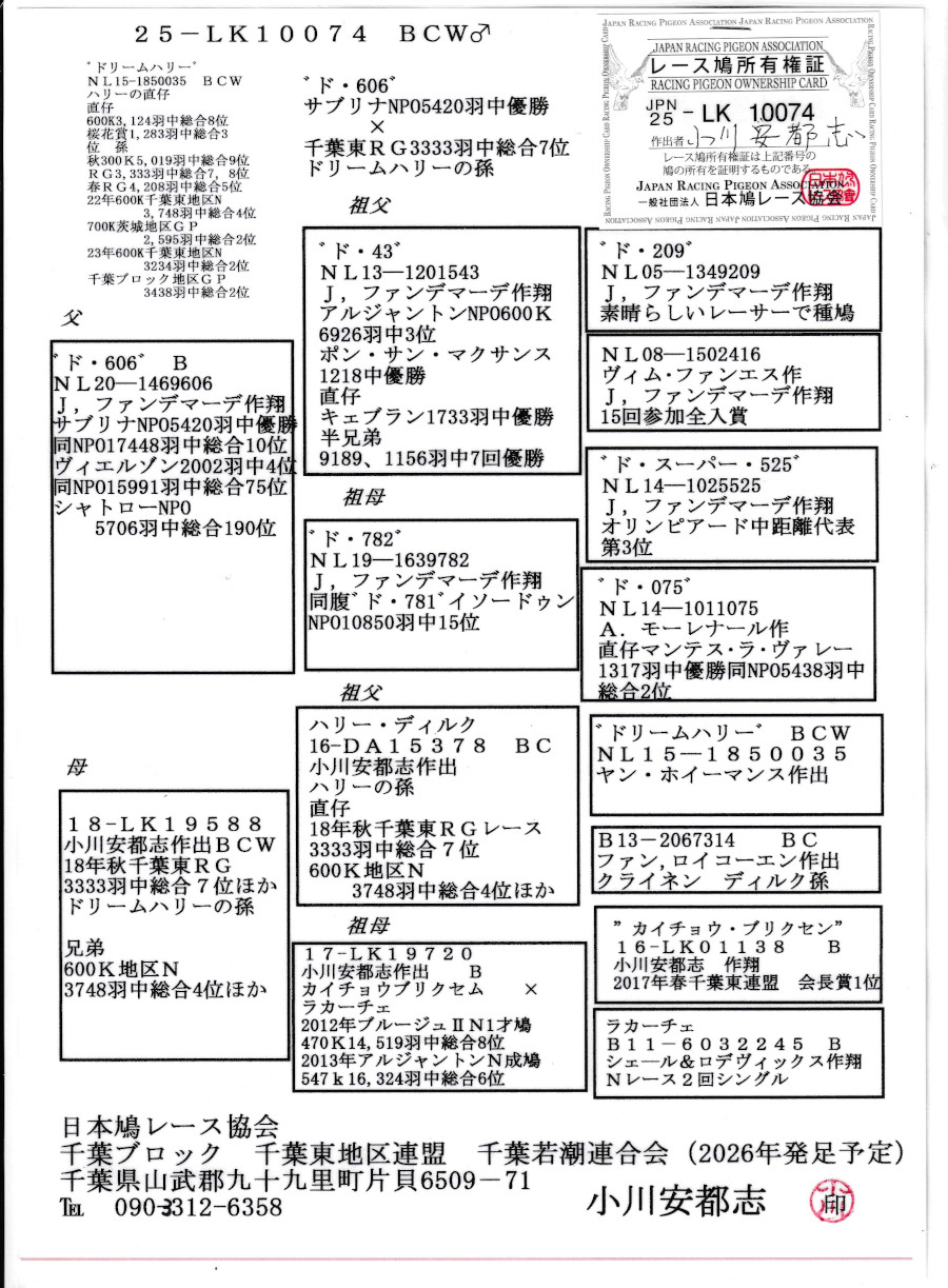 出品鳩若15番「25LK10074 BCW」小川作ファンデマーデ作翔サルプリNPO5420羽総合優勝×(ドリームハリー号×RG総合7位&トレリームハリー号孫) ![]() |