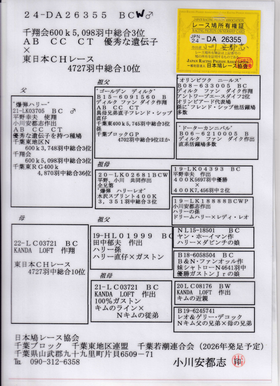 出品鳩成12番「24DA26355 BCW♂」小川安都志作爆弾ハリー号PN3748羽総合3位千翔会5098羽総合3位×神田L作翔東日本CH4727羽総合10位 ![]() |