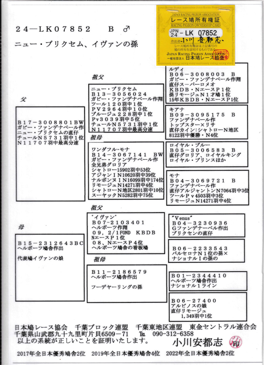 出品鳩成4番「24LK07852 B♂」小川安都志作カビー作代表鳩ニュー・ブリクセン号直仔×ヘルボッツ作イヴァン号KBDBNエースP4位FOND-KBDBNエースP1位の娘 ![]() |