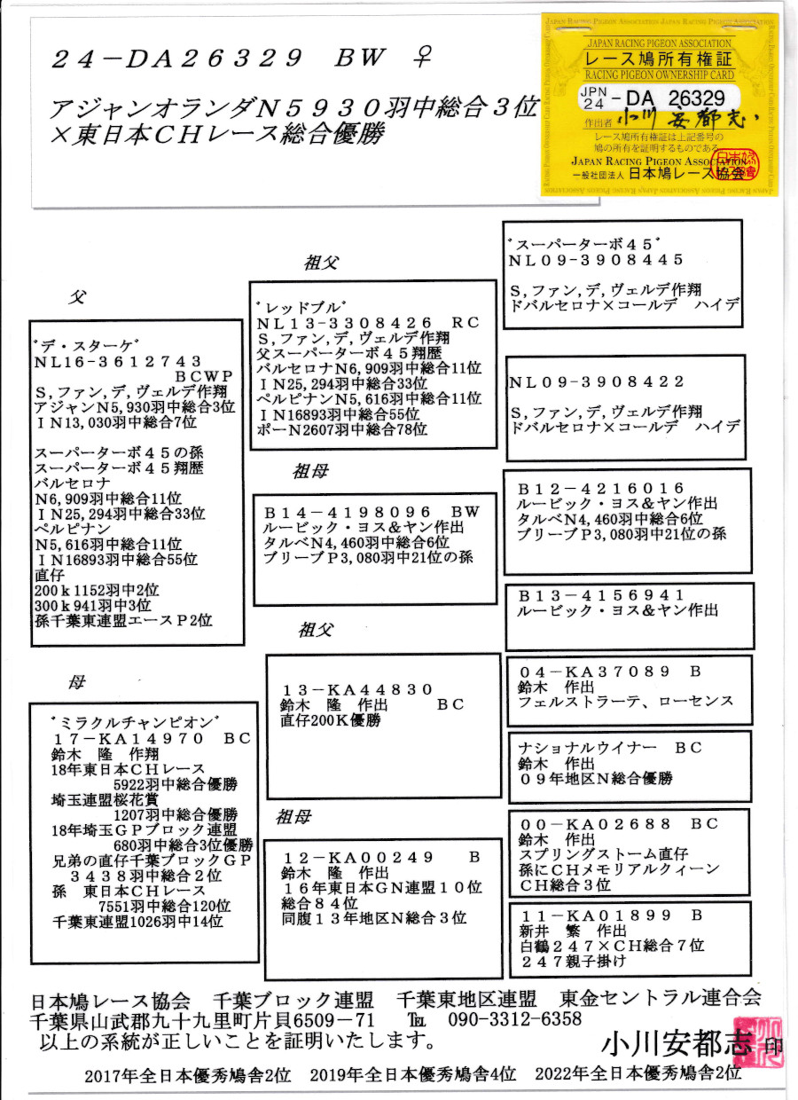 出品鳩成7番「24DA26329 BWP♀」小川安都志作デ・スターケ号ファンデウエルデ作翔アジャンN3位IN7位×ミラクルチャンピォン号東日本CH5922羽総合優勝 ![]() |