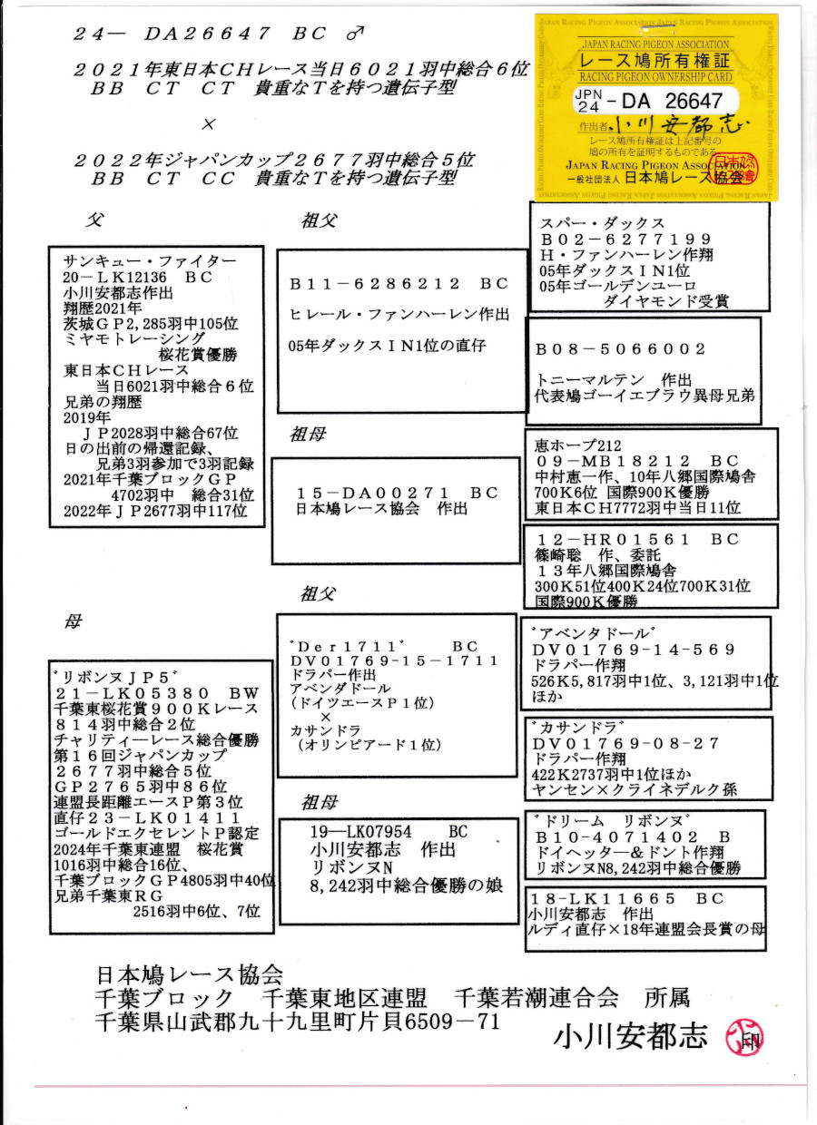 出品鳩成22番「24DA26647 BCW♂」小川安都志作サンキュウファイター号桜花賞優勝東日本CH総合6位×リボンヌJP5号桜花賞総合2位JC総合5位連盟長距離AP3位 ![]() |
