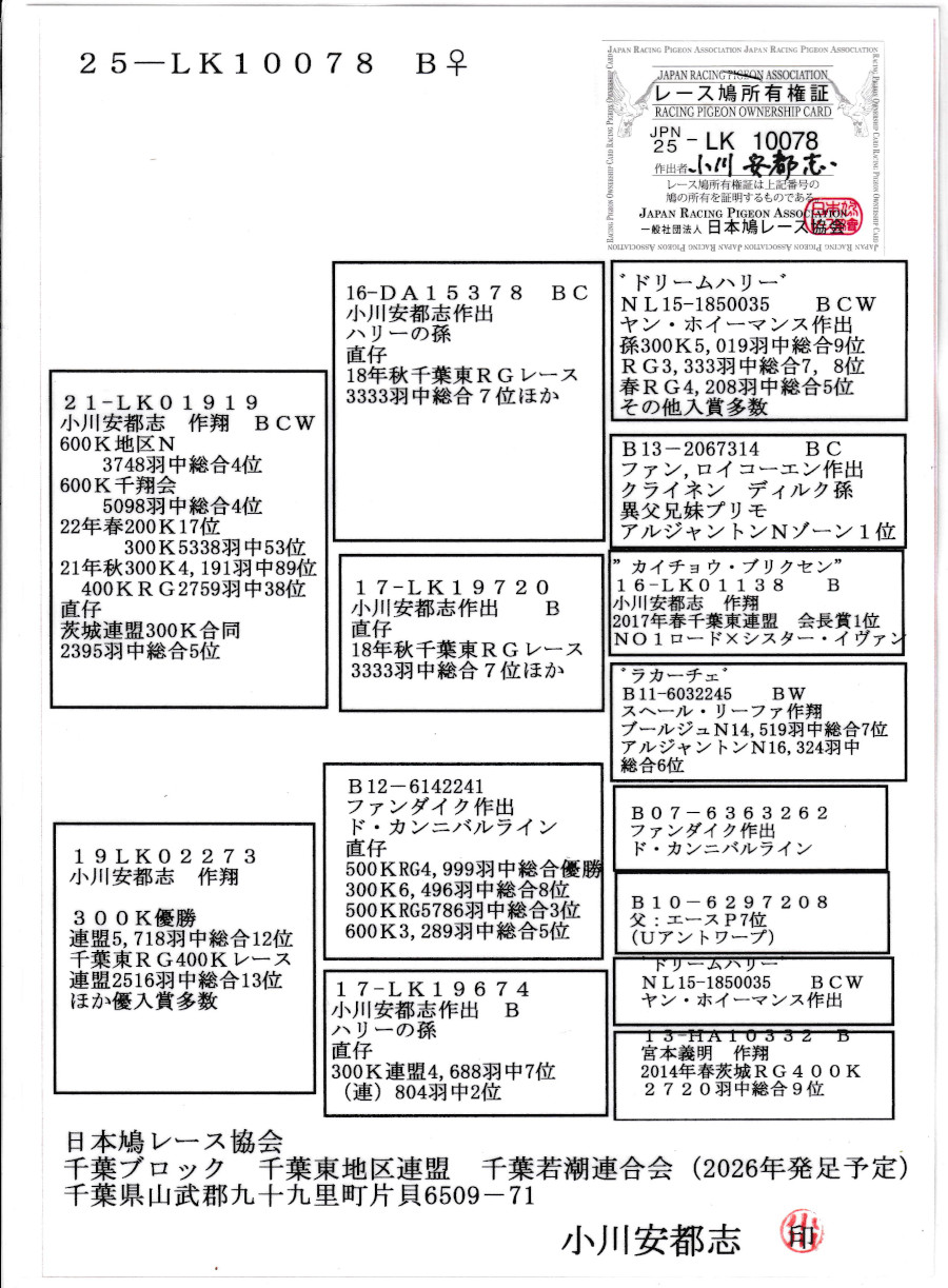 出品鳩若17番「25LK10078 B」小川安都志作半兄弟)茨城300k2395羽総合5位 地区N600k3748羽総合4位×300k5718羽総合12位RG2516羽総合13位 ![]() |