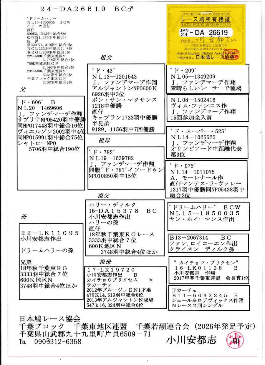 出品鳩リスト外「24DA26619 BC♂」小川作ファンデマーデ作翔サルブリNPO5420羽総合優勝×ドリームハリー号孫&RG総合7位地区N総合4位の兄弟 ![]() |