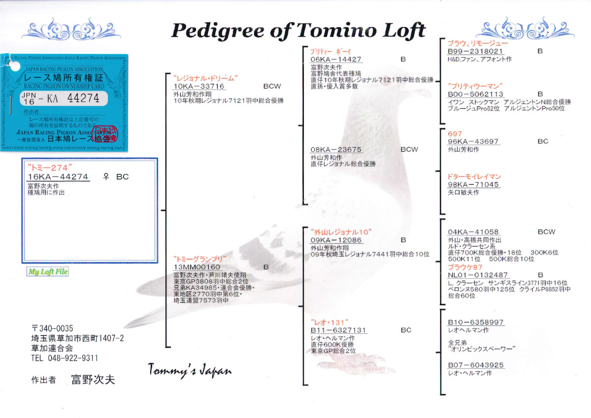 出品鳩「16KA44274 BC♀」富野次夫作レジョナル・ドリーム号秋レジョナル7121羽総合優勝×トミーグランプリ号東京GP3808羽総合2位鳩 ![]() |