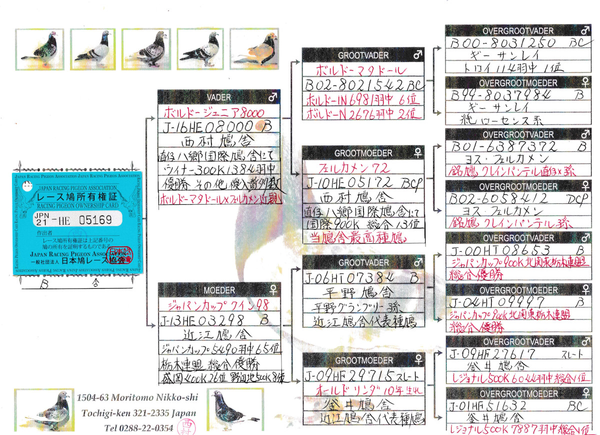 出品鳩「21HE05169 B ♂」西村一夫鳩舎作異母兄弟に八郷国際ウイナー300K1384羽全国優勝鳩がいる ボルドージュニア8000号(ボルドーマタドール号ボルドーN2位IN6位直仔)×ジャバンカップクイン98号近江作翔Jカップ5490羽総合65位栃木連盟総合優勝鳩 との直仔です。 父親 "ボルドージュニア8000号"「16HE08000 B」西村一夫鳩舎作 直仔に八郷国際ウイナー300K1384羽全国優勝鳩がいる ボルドーマタドール号ボルドーN2676羽2位IN6981羽総合6位 × フェルカメン72号(八郷国際CH900K全国13位の母親&両親フェネカメン作クレインパンテル近親鳩)との直仔です。 母親 ”ジャバンカップクイン98号”「13HE03298 B」近江鳩舎作翔 ジャパンカップ5490羽総合65位栃木連盟総合優勝鳩で 平野作(JC北関東栃木連盟総合優勝×同総合優勝)直仔×釜井作(RG6044羽総合優勝×RG7887羽総合優勝)娘鳩 との直仔です。 詳しくは、血統書を参照してください。 <備考> 現在管理人の鳩舎で元気に暮らしています。写真11/29日に撮影しました。 菅原明鳩舎の概要はこちらをご覧ください |