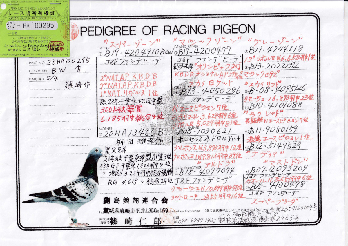 出品鳩♂27番「23HA00295 BW♂」篠崎仁郎作ファンデヒーデ作スカイロケット号KBDB-Nエース7位直仔×柳田作地区N総合優勝GP総合8位半兄弟 ![]() |